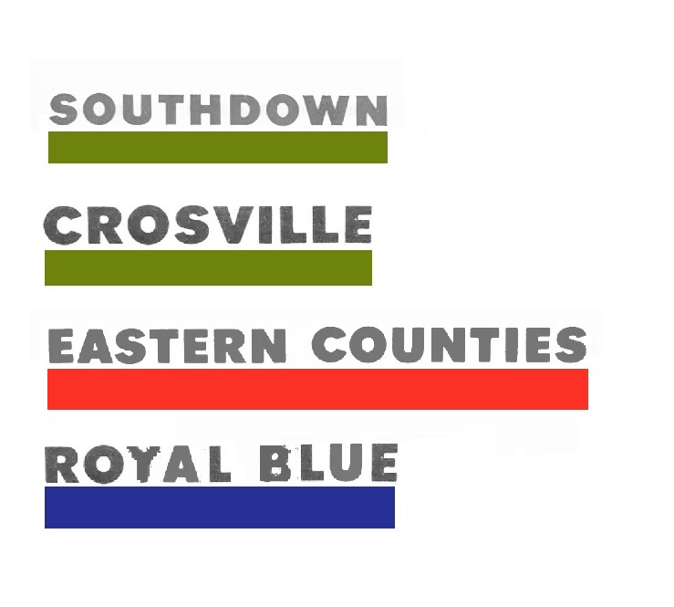 So Eastern Counties and United coaches had a small fleetname underlined in their corporate red; as did Standerwick, a coach-only business which adopted the bus colour of its parent company Ribble. Crossville, Southdown and Eastern National coaches meanwhile appeared with fleetnames underlined in green. Other non-bus coaching businesses were given latitude, so even though their historic colours were eliminated, Royal Blue used a blue line on their National coaches, while Black and White used black.