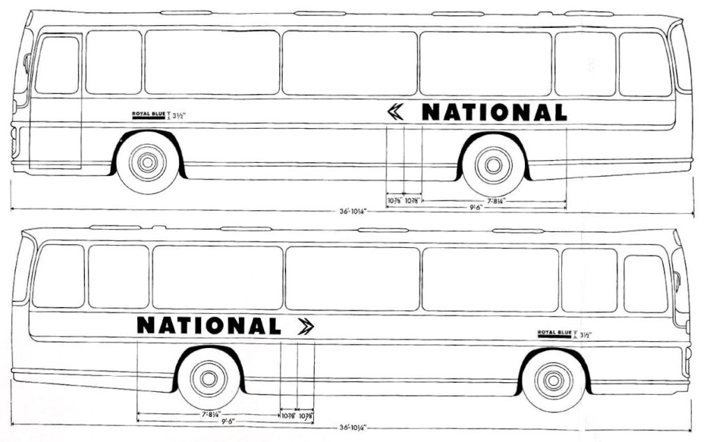 North Western’s Leyland Leopard SJA 404K is seen in Stockport in 1972 on an express service from London to Manchester via Birmingham, with a small fleetname underlined in National red.Eastern Counties’ CB845 – a Duple-bodied Bedford VAM70 at Great Yarmouth in 1972 – illustrating both the small operating company fleetname, underlined in poppy red, and displayed in the illuminated panel; and also the challenges of fitting the key elements of the new Corporate Identity around decorative chrome bodywork. Norman Wilson’s team were supplied by coachbuilders with hundreds of coach drawings as they tried to get a reasonably uniform application of the new identity across a huge variety of vehicles. (Photo: Bernard Watkin, Eastern Transport Collection Society).Uniquely, Black & White Motorways, having no standard bus colour, adopted black underlining for its fleetname. Here Black & White coach DDG 260C – a Duple Commander-bodied Leyland Leopard – shows off the early version of the white coach identity, in Cheltenham in 1973.Standerwick – the coaching branch of Ribble – operated the largest coaches of the era, a fleet of thirty Bristol VRLL double-decker coaches – providing an express service between Manchester, Birmingham and London making full use of the new national motorway network. Standerwick’s fleetname is underlined in the Ribble bus colour of poppy red, in a vast expanse of white. Photo: Tony Whitehouse, NBC Publicity.Southdown’s Leyland Leopard LCD 232F in February 1973, with a small fleetname underlined in National green, and a small ‘National’ logotype in the illuminated panel at the front. Photo: Richard Price Collection. Eastern Counties’ Bristol MW coach LS830 shown in April 1974 in the early National livery, with local fleetname underlined in poppy red. In the bus shortage of the early 1970s, front-line express coach LS830 has been pressed into service on a local Norwich city route. The clock tower of Norwich City Hall towers over the Bell Hotel in the background. (Photo: Bernard Watkin, Eastern Transport Collection Society).From the 1972 Corporate Identity Manual: these two illustrations show the appropriate positions of the NATIONAL logotype and the operating company fleetnames on two Bristol RE coaches with different decorative bodyside mouldings. Norman Wilson’s team worked through hundreds of coach body designs to work out how to get a consistent application of the new identity across a huge variety of different vehicles. Both United Counties and Crosville fleetnames would have been underlined with a bar in NBC green, the bus colour used by both companies. Source: NBC, The Bus Archive.